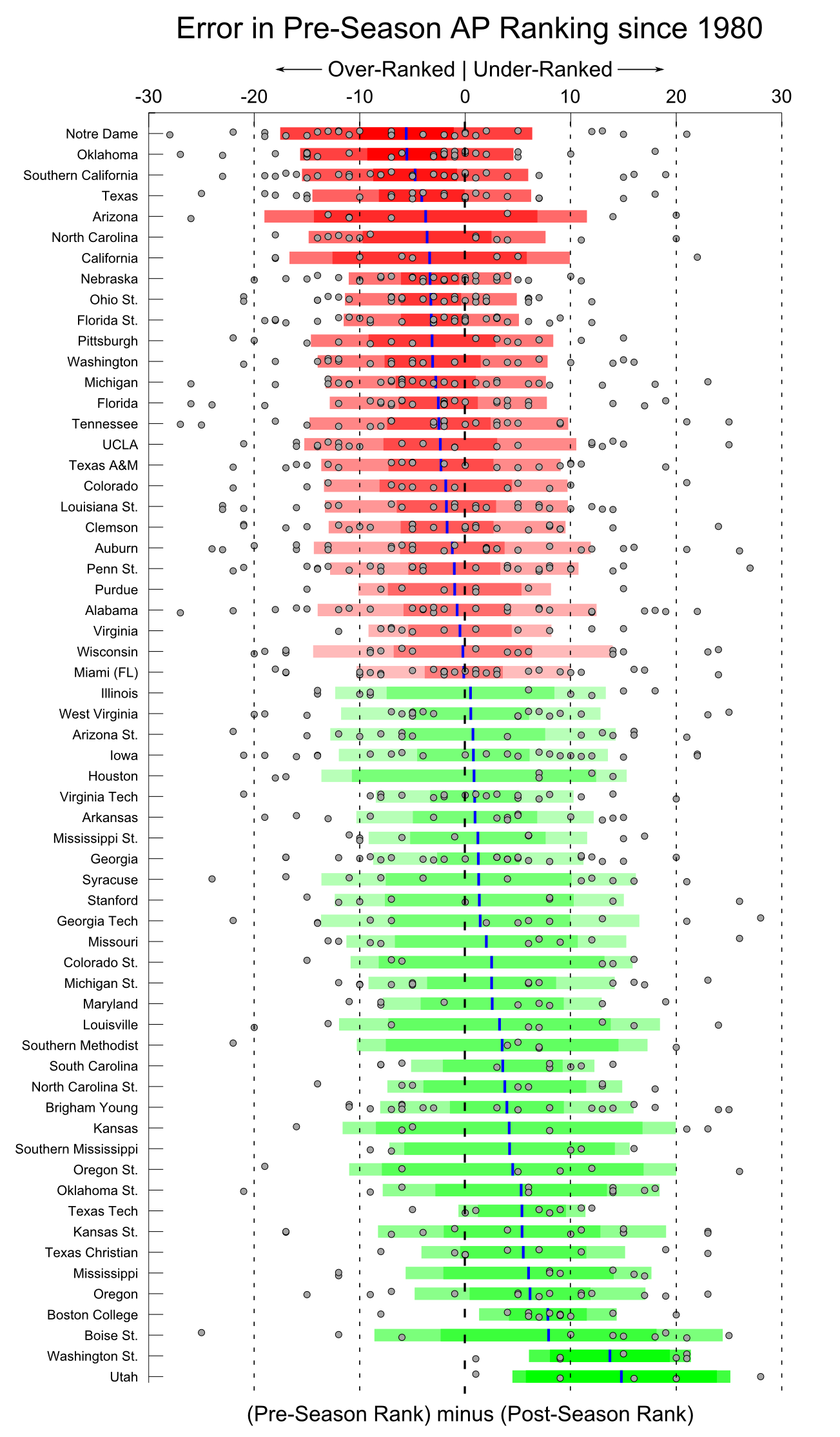 Here is an interesting chart of the most over and underrated teams since 1980. This takes into account the error between the preseason and final AP rankings. Not surprisingly Notre Dame takes the cake at #1, while Virginia Tech appears to be slightly underrated.